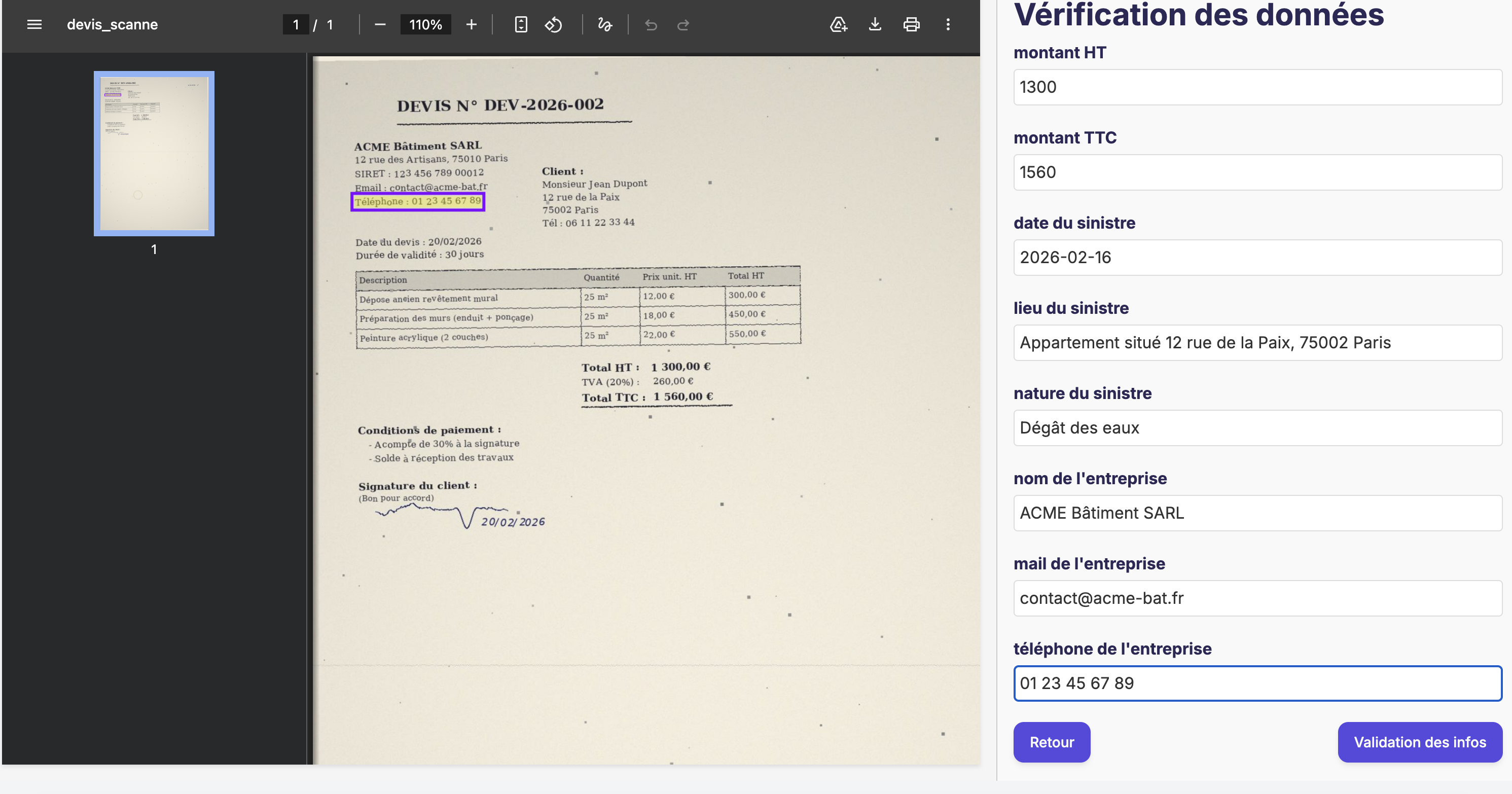 L'interface se divise en deux volets. À gauche, le résultat de l'inférence du LLM (résumé, données structurées, réponse du chatbot…). À droite, le document source. Quand l'utilisateur clique sur un élément du résultat, le volet droit affiche automatiquement la page concernée avec le segment de texte pertinent surligné.